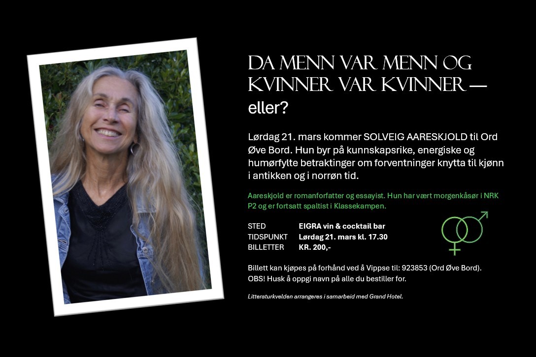 Solveig Aareskjold is coming to Ord øveve Bord. She offers knowledgeable, energetic and humorous reflections on gender expectations in antiquity and in Norse times.