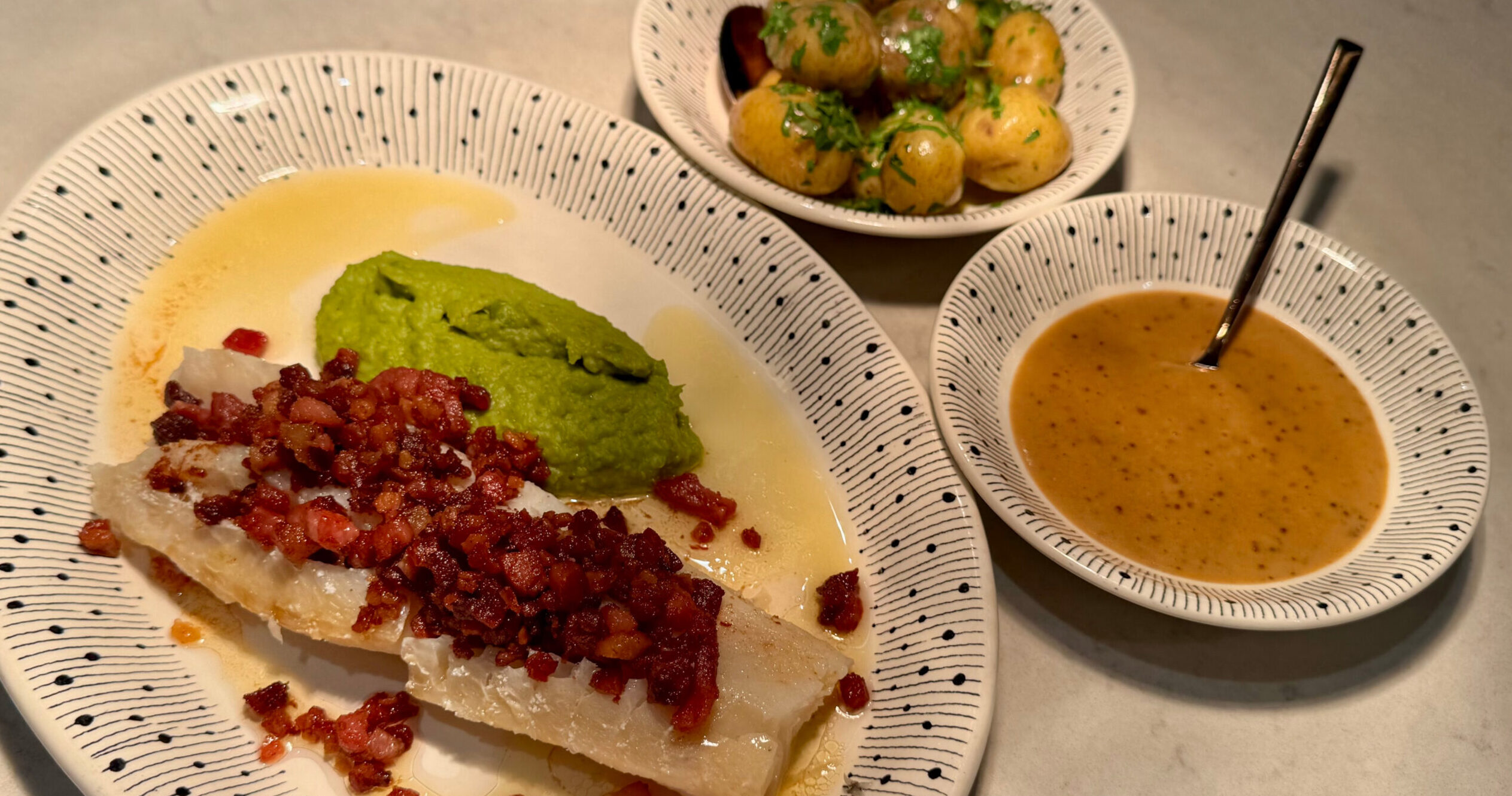 På menyen står kvalitetslutefisk med loin fra Brødrene Berg, servert med ertekrem med piement d’espelette, gulløyepoteter, sennepsaus, Liss Ellas sennep, flatbrød og bacon i fra Nyyyt.
